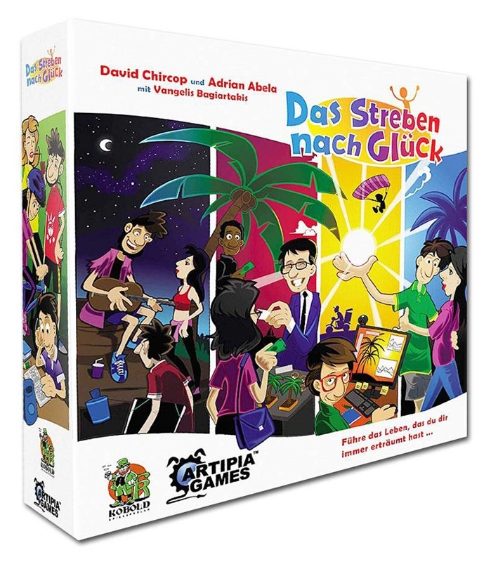 Das Streben nach Glück wurde von David Chircop und Adrian Abela als Pursuit of Happiness erdacht und von Panayiotis Lyris farbenfroh illustriert. 2 bis 4 Spieler steuern ihren eigenen Charakter wie in einem Arbeiterplatzierspiel mit hölzernen Sanduhrmarkern, die für die aufgewendete Lebenszeit stehen. Je nach eigener Gesundheit und dem Alter.