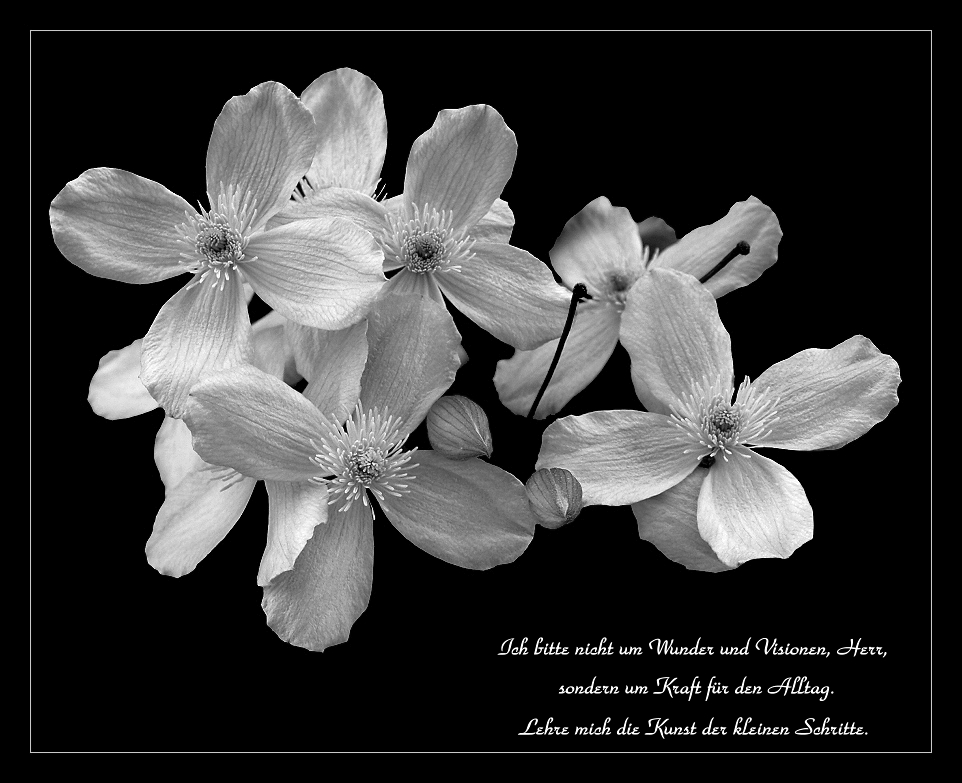 Die Kunst der kleinen Schritte. Ich bitte nicht um Wunder und Visionen, Herr, sondern um die Kraft für den Alltag. Lehre mich die Kunst der kleinen Schritte. Mach mich sicher in der rechten Zeiteinteilung. Schenk' mir das Fingerspitzengefühl, um herauszufinden, was erstrangig und was zweitrangig ist. Schenk' mir die nüchterne Erkenntnis,