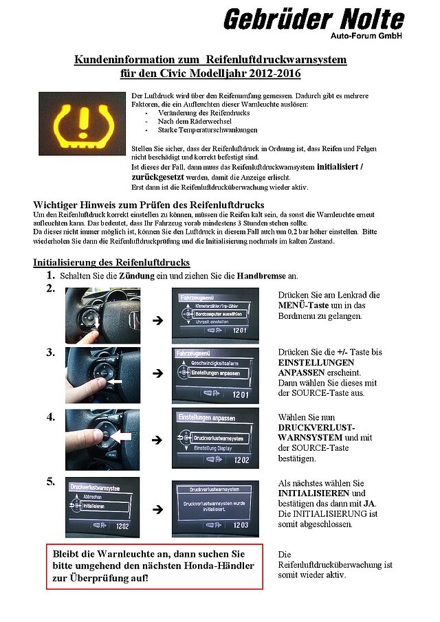 So geht's: Den Reifendruck des Honda Civic resetten / speichern. Hinweis: Je nach Honda Civic Modell / Baureihe und Ausstattung weichen die Schritte zum Reifendruck Reset möglicherweise leicht ab. Konsultieren Sie im Zweifel immer noch einmal Ihre Betriebsanleitung.Für Ergänzungen zu weiteren Baureihen hinterlassen Sie einen Kommentar oder schreiben Sie einen Artikel!